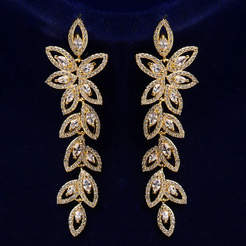 To olśniewający, długi model, który zachwyca misternym, roślinnym wzorem i imponującą kaskadą blasku. Ich zjawiskowa, rozbudowana forma, przypominająca delikatne pnącze lub girlandę, została w całości wysadzana lśniącymi kryształami.